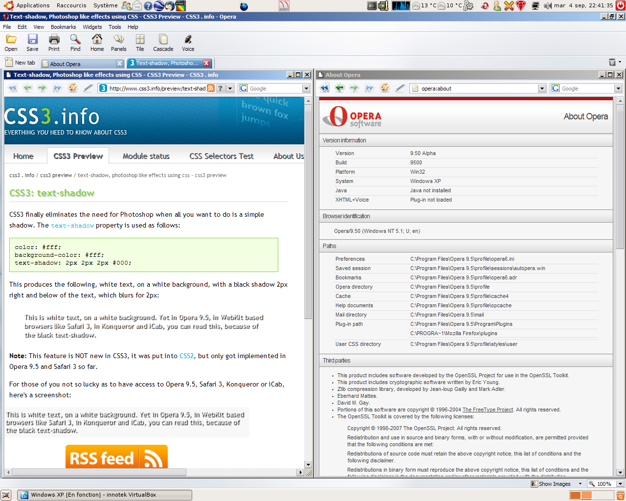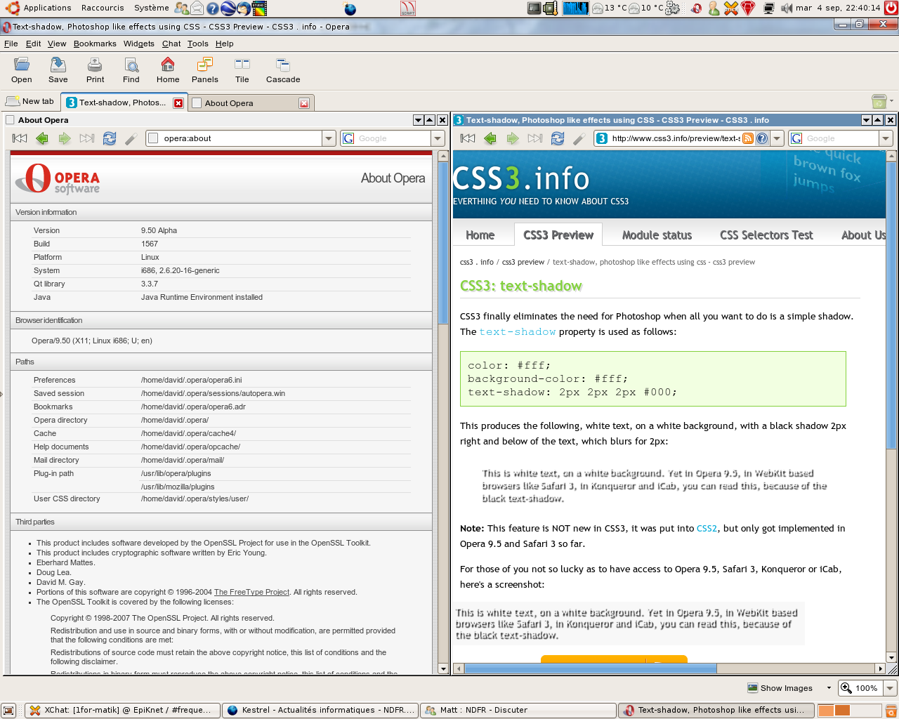 Bon bref... Kestrel est le nom de code officiel d'Opera 9.5. Grooooossse révolution pour le navigateur ! Et ben ça tombe bien, la 1ère alpha d'Opera 9.5 vient de sortir ce matin avec une pléthore de nouveautés que ce soit sur Windows, Mac ou Linux. Mais quand je dis une pléthore de nouvelles fonctions, je parle du support de la plupart des fonctions de CSS3, quelques-uns de HTML 5, DOM 3 et SVG. Sans compter l'amélioration des performances globales, de la recherche dans l'historique, de la synchronisation des favoris avec la plate-forme en ligne my.opera.com. A noter également que la fonction mail et flux RSS utilisent un nouveau format d'indexation (de toute façon normalement la conversion est proposée lorsque l'on met à jour depuis la version 9.23) Attachment 559 Attachment 560 Pas de révolution visuelle pour le moment sous Linux (Thème Human pour Opera) ni sous Windows (thème par défaut) Le Changelog [download] Télécharger Opera 9.50 Alpha 1 build 9500 pour WindowsRendering Engine * Fixed numerous stability issues * Plugged numerous memory leaks * Plethora of performance improvements throughout * Added support for the CSS3 overflow-x and overflow-y properties (demo) * Added support for the CSS3 text-shadow property (demo) * Added support for the CSS3 Selectors (demo) * Added support for the CSS3 outline-offset property (demos) * Added support for the CSS3 background-size property (only accessible via the custom -o-background-size property) * Added support for the CSS3 currentColor color keyword * Added support for the CSS2.1 white-space: pre-line value ... La suite par là : [view] Changelog Windows [view] Changelog Mac [view] Changelog Unix/Linux [download] Télécharger Opera 9.50 Alpha 1 build 4404 pour Mac [download] Télécharger Opera 9.50 Alpha 1 build 1567 pour Unix/Linux [source] Source : Opera Desktop Team blog http://www.n1fo.fr/ndfr.gif |