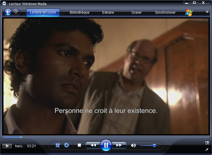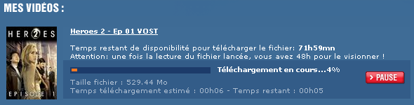 Alors concrètement, qu'est-ce que ça donne ? Eh bien après un téléchargement très rapide, on a droit à un fichier "heroes_2_ep_01_vost_t.wmv" de 529 Mo (avec bien entendu des DRM qui n'autorisent sa visualisation que pendant 48h après le premier lancement, qui, lui, peut survenir dans les 30 jours suivant l'achat). Attachment 569 Les informations GSpot Le fichier est une vidéo WMV9 encodée avec un VBR de 1500kbps ; sa dimension est de 720x409 et la qualité est dans l'ensemble assez bonne (quoi qu'un peu baveuse par moments, mais c'est sans doute dû au codec). Pour ce qui est du son : il s'agit de WMA9, 128 kbps stéréo. Enfin, la traduction (les sous-titres sont incrustés) est correcte, sans pour autant être parfaite (trop littérale). Attachment 570 Une petite capture d'écran (sans spoiler) En conclusion, si vous souhaitiez regarder votre série préférée légalement, "avant tout le monde", et que les sous-titrages ne sont pas un problème pour vous (ou que vous n'en avez pas besoin), TF1 Vision est sans doute, pour 2,99€ par épisode tout de même, la réponse à vos attentes. De plus, gageons que si le succès est au rendez-vous, d'autres séries feront leur apparition. [source] TF1 Vision |