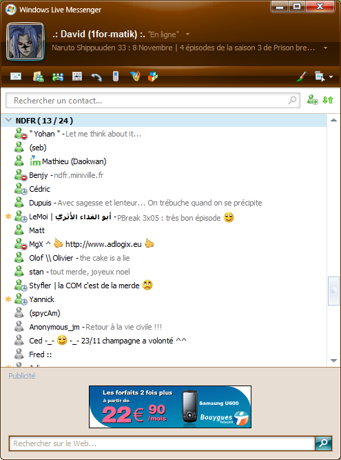 Windows Live Suite est en fait un regroupement de plusieurs programmes étiqueté "Windows Live" dont Windows Live Messenger 2008, Windows Live Mail 2008, Windows Live Writer 2008, Windows Live Photo Gallery 2008, Windows Live OneCare Family Safety, Windows Live Toolbar et l'assistant de connexion Windows Live. Je me permet donc de présenter les différents programme de cette suite (ou d'en faire un rappel) : Windows Live Messenger 2008 (version 8.5.1302.1018 ) : Je pense que c'est le logiciel de cette suite qui intéressera le plus grand monde, malheureusement, c'est celui qui a subi le moins de modification par rapport à l'ancienne version. On pourra noter tout de même l'aspect très "Vista" du logiciel ainsi qu'une intégration des services OneCare (installation proposée d'un antivirus lite pour les transferts de fichiers) ainsi qu'un nouveau smiley "lapin". En effet, Microsoft se réserve pour la conception de ce qui sera Windows Live Messenger 9.0 (ou 2009) où l'interopérabilité avec les réseaux ICQ, GTalk et AIM a été annoncée. Windows Live Mail 2008 (version 12.0.1606) : Outlook Express était peu performant et pas très sécurisé, et Windows Mail, malgré son interface et son filtre anti-phishing, n'arrivait même pas encore à la hauteur de ses concurrents tels que Thunderbird. Mais ces lacunes ont été comblées. Avec Windows Live Mail 2008, Microsoft propose un client mail plus robuste, plus clair avec son interface style Office Outlook, une sécurité accrue et une meilleure intégration avec Windows Live Hotmail, Spaces. Il permet de paramétrer les webmails tels Gmail ou Yahoo! Mail plus simplement sans oublier ses fonctions de lecteurs de newsgroups et de flux RSS. Windows Live Writer 2008 (version 12.0.1366.1026) : Ce logiciel est destiné à ceux qui tiennent un blog. Il permet tout simplement d'éviter de se connecter à l'interface d'administration du-dit blog pour créer un nouveau billet. Il est naturellement compatible avec Windows Live Spaces, mais aussi avec tous les autres types de blogs (Wordpress, Dotclear etc.). Windows Live Photo Gallery (version 12.0.1308.1023) : Pour les utilisateurs de Windows Vista, ce logiciel est identique à celui fourni avec le système d'exploitation. Néanmoins, il intègre plus de fonctions de correction de photos et une option permettant la publication des photos sur Windows Live Spaces, MSN Video ou encore le service Flickr. Pour les utilisateurs de Windows XP, c'est un joli logiciel pour gérer une bibliothèque d'images ou de vidéos, mais nécessitant l'installation de Windows Desktop Search 3.01 en supplément. Windows Live OneCare Family Safety : Logiciel au nom anglais évasif... OneCare Family Safety est tout bêtement un logiciel de contrôle parental dérivé de la suite de sécurité Windows Live OneCare. Ces logiciels sont d'ores et déjà disponibles en un seul logiciel à télécharger, il s'occupera du reste après votre choix des logiciels à installer. [download] Télécharger Windows Live Installer 12.0.1471.1025 (2,29 Mo) A noter qu'à partir de cette version, les mises à jour des logiciels sont intégrées au service Microsoft Update. http://www.n1fo.fr/ndfr.gif |