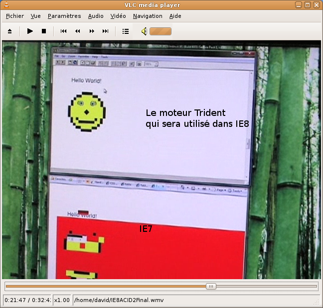 En effet, à la date du 12 décembre 2007, une des moutures du moteur Trident (moteur utilisé dans Internet Explorer) a passé sans encombre le test Acid2. Cependant, nous n'aurons pas de confirmation extérieure à l'équipe de développement avant le prochain MIX'08, prévu du 5 au 7 mars prochain, où une 1ère version bêta d'Internet Explorer 8 sera lâchée dans la nature. Néanmoins, les développeurs ont laissé une petite vidéo qu'il est possible de regarder en streaming ou en la téléchargeant sur leur portail dédié Channel 9. Un aperçu en une image : Attachment 672 En bas : Internet Explorer 7, en haut : le moteur Trident d'IE8 [source] Le post expliquant le comment du pourquoi [video] La vidéo du pourquoi du comment (ATTENTION ! Le téléchargement de la petite vidéo de 32 minutes pèse pas moins de 584 Mo, anglophobes déconseillés) http://www.n1fo.fr/ndfr.gif |