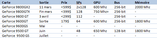 On continue avec NVIDIA, qui a mis à jour les dates de sortie et les prix des modèles de la série GeForce 9 avec l’ajout du modèle 9500. Il y a quelques ajustements concernant les autres cartes, par contre la date de sortie de la GeForce 9800GX2 reste fixée au 11 mars. La GeForce 9800GT est déjà prévue le 3 avril, tandis que la 9800GTX arrivera fin mars. Toutes les GeForce 9 sont prévues pour sortir au printemps et la GeForce 9600GS apparaîtra au plus tard en mai.