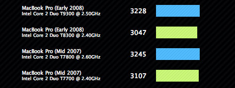 Voici le gain par rapport entre les macbook ancienne génération (avec processeur Merom 0,65nm) et nouvelle génération (processeur Penryn 0,45nm). |