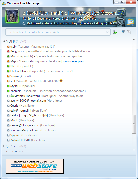 Non je plaisante... :-p Sinon, dans l'état actuel, sous Windows 2008 Server, WLM refuse catégoriquement de se connecter... J'ai ma petite idée du pourquoi, j'essaierai à midi. Pas encore essayé (ni installé) les autres logiciels de la suite, mais je vais le faire pour me faire une idée.. Juste un ou deux défauts/bugs qu'il serait bon de corriger sur WLM (genre les smileys perso) EDIT : Ah et un petit truc non signalé... la possibilité de prendre une capture webcam comme image perso, ou encore utilisé différentes captures webcam et les utiliser en combinaison avec des "moods" (états d'humeurs) prédéfinis. |