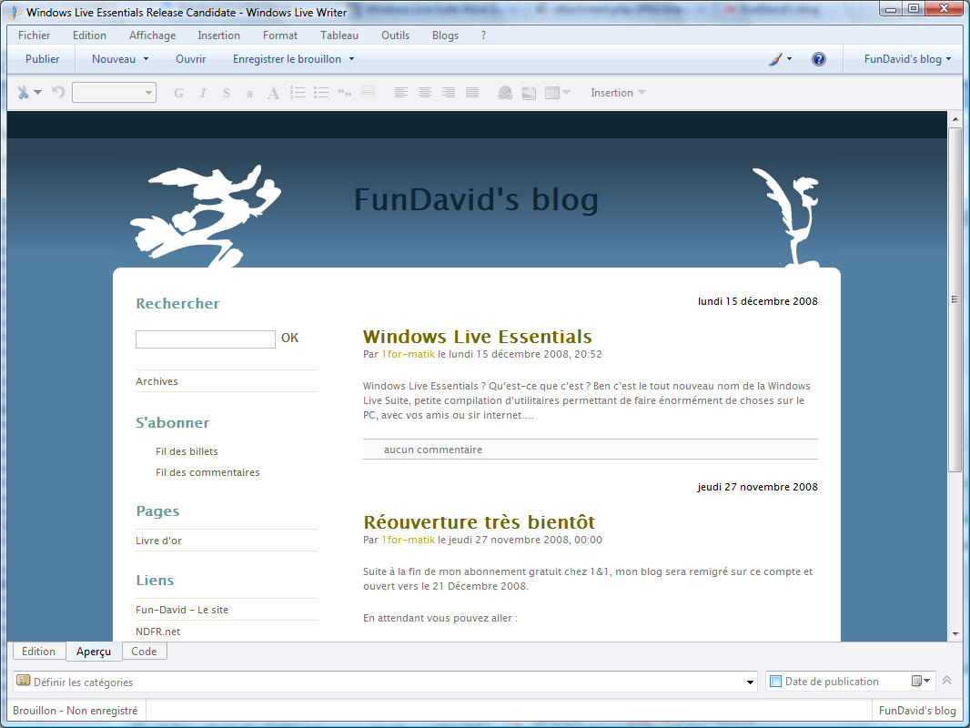 Oui, Microsoft vient d'annoncer que la version Bêta ou RC (on ne savait pas ce que c'était à l'époque) est tout bêtement la version finale. Alors naturellement, rien n'empêche Microsoft de publier des correctifs plus tard, mais carton rouge à l'entreprise pour nous avoir un peu berné et jeté le produit dit "non finalisé" comme une chaussette alors que l'on attendait d'autres corrections de bugs et au moins une version finalisée de Live Movie Maker. Bref, petit coup de gueule passé, vous pouvez donc voir ou revoir toutes les nouveautés de la version finale par ici. [download] Télécharger Windows Live Essentials 2009 http://www.n1fo.fr/ndfr.gif |