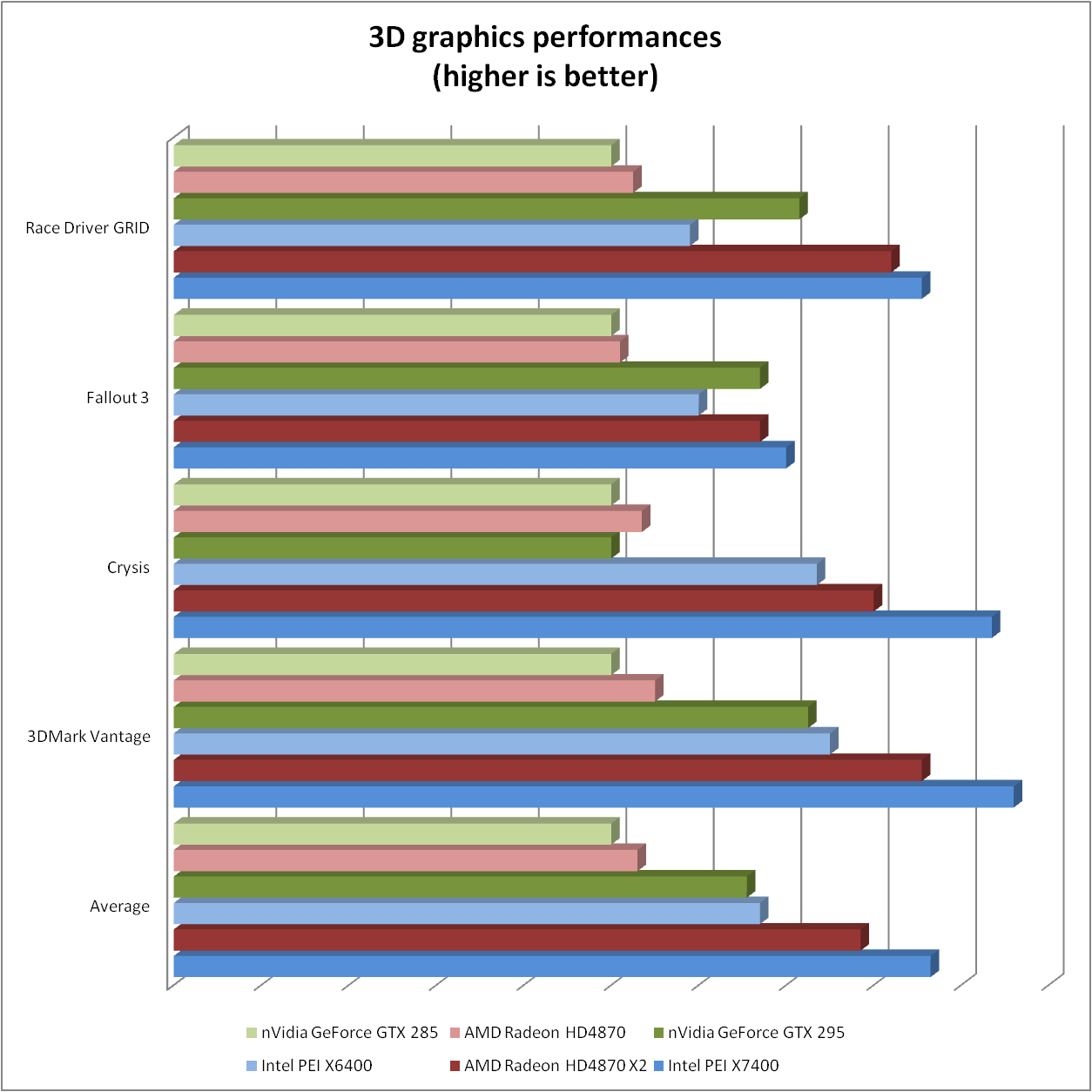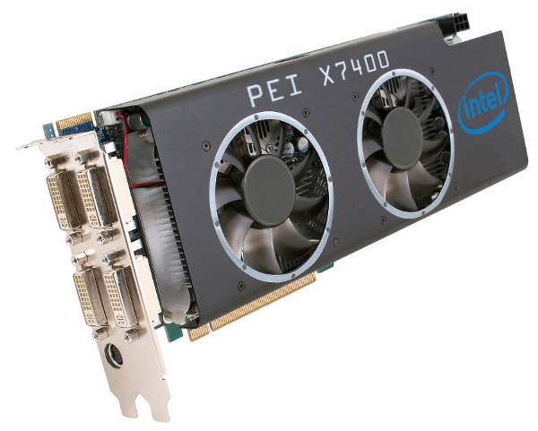 Depuis, de nombreuses rumeurs ont évoqué le retour d'Intel sur le marché de la carte graphique, en particulier avec le projet Larrabee, un projet à relativement long terme, qui vise à mettre au point une carte graphique basée sur une multitude de coeur x86, dont Intel a déjà fait une démonstration il y a quelques temps. Mais que faire en attendant la disponibilité de Larrabee ? Rien ? Non ! Le fondeur a en effet décidé d'occuper le marché avec une puce graphique plus conventionnelle, l'Intel PEI. Conçue dans le plus grand secret, cette puce a été présentée aujourd'hui par Intel, pour une commercialisation immédiate. Elle embarque 256 shaders processors cadencés à 2.0 GHz (contre 240 à 1.5 GHz pour la GeForce GTX 285 d'nVidia et 800 à 750 MHz sur la Radeon 4870 d'ATI), ce qui lui confère donc une puissance brute supérieur de 40% à la plus puissance des puces nVidia. Le rendu sera pour sa part confié à 48 unités de texturing et 16 ROPs à 2 GHz (80/32 à 650 MHz sur GTX 285 et 40/16 à 750 MHz sur Radeon 4870 X2), le tout assisté par 1 à 2 Go de RAM GDDR5 à 1.6 GHz sur un bus 512 bits, soit une bande passante mémoire record de 190 Go/s (environ 150 Go/s sur GTX 285 et 110 Go/s sur Radeon 4870). Dans un premier temps, Intel distribuera directement cette puce, intégrée à deux modèles des cartes : la PEI X6400 embarquant une puce PEI à 2 GHz et 1 Go de RAM et la PEI X7400, dotée de deux puces PEI à 2 GHz et de 2 Go de mémoire. Toutefois, contrairement aux solutions bi-GPU concurrentes, la PEI X7400 se comportera exactement comme s'il s'agissait d'une unique puce dotée de deux fois plus d'unités de calcul et d'un bus mémoire deux fois plus large. Les premiers benchmarks de ces cartes sont disponibles et montrent qu'elles se défendent très bien face aux concurrentes, qu'elles parviennent à globalement surpasser, tant en mono-GPU qu'en bi-GPU, tout en ayant une consommation relativement modérée, en particulier en idle. Dans un second temps, Intel ouvrira la puce aux constructeurs de cartes désirant l'intégrer à leurs produits. Une version haut de gamme fonctionnant à plus haute fréquence serait également prévue, tandis que des versions dotées de moins d'unités de calcul devraient arriver sous peu pour l'entrée de gamme. Un nouveau GMA basé sur l'architecture PEI devrait également être de la partie. [source] Source : Infobidouille |