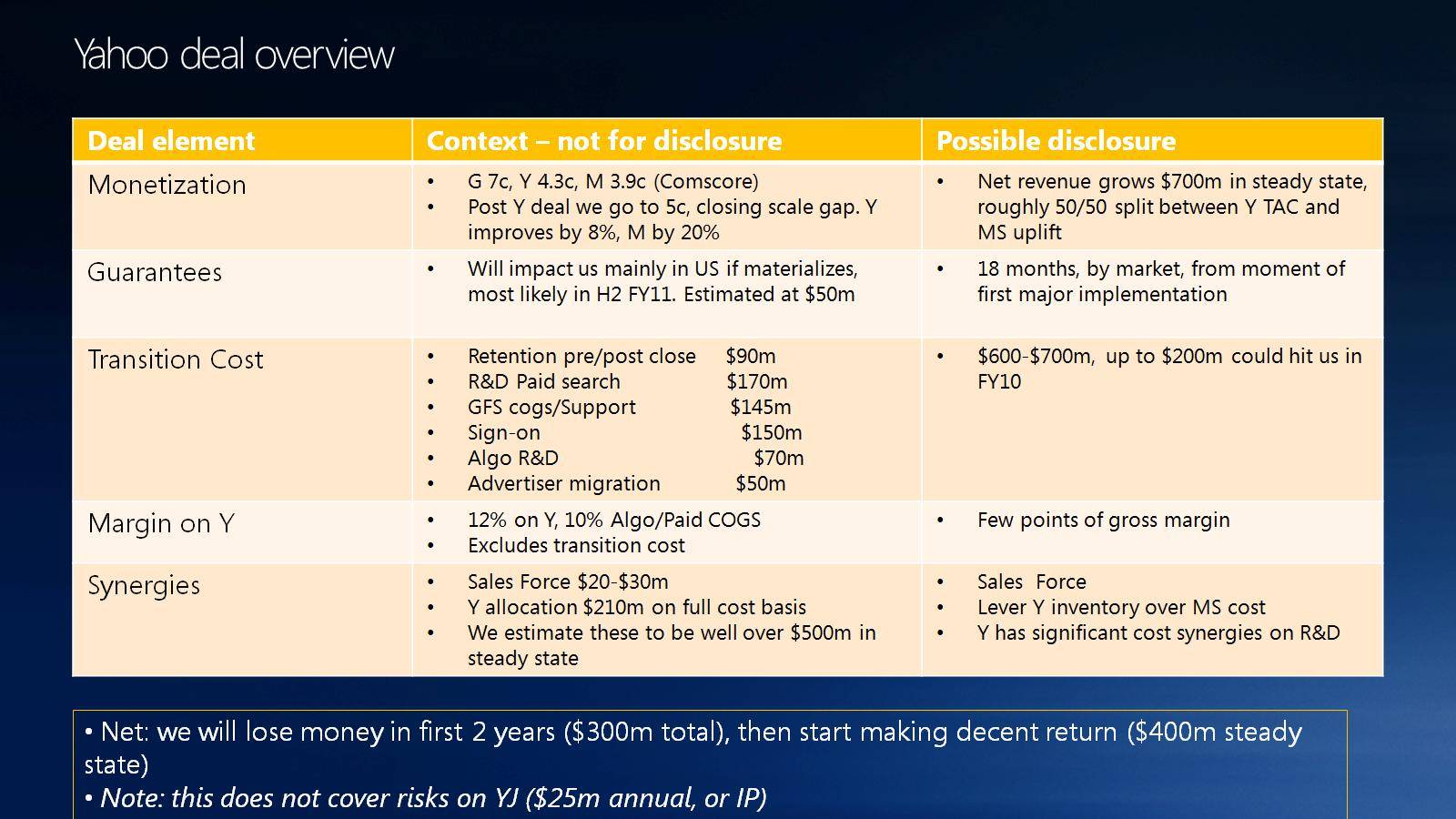 Il y est dit que Microsoft va perdre pendant les deux premières années 300 millions de dollars avant de commencer à faire des profits. Microsoft prévoit également des coûts de transition pour l’opération de l'ordre de 600 millions à 700 millions de dollars, selon la diapositive ci-dessus. [source] Source : The Seattle Times |