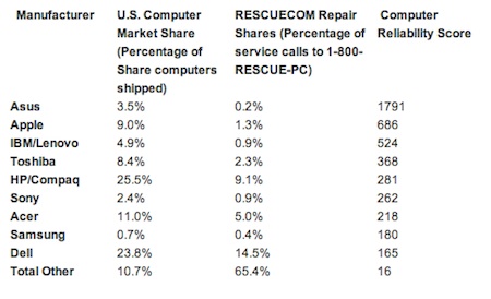 C'est Rescue.com qui nous apporte ses chiffres issus tout droit de son réseau de réparation des ordinateurs ayant leur garantie expirée. Attachment 1096 On peut voir alors, que dans ce rapport daté du 30 Aout, Apple est en tête du classement avec la deuxième place. Ce rapport fait état des réparations mais ne mentionne en aucun cas les machines non réparées mais sachant que les ordinateurs Apple sont les plus compliqués à réparer ... on peut lui donner toute sa crédibilité pour cette marque. |