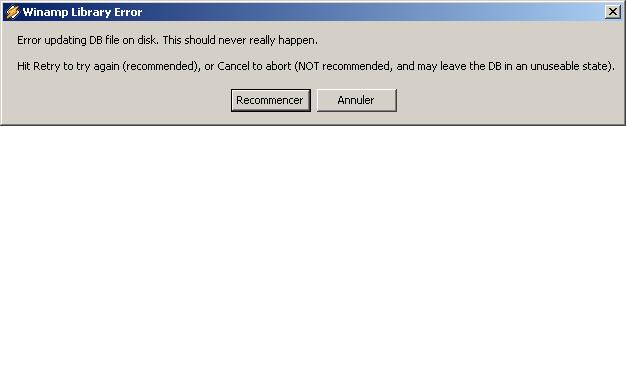 Je fais la traduction : Erreur pendant la mise à jour du fichier DB du disque.Ceci ne devrait jamais vraiment ce produire. La preuve que si !