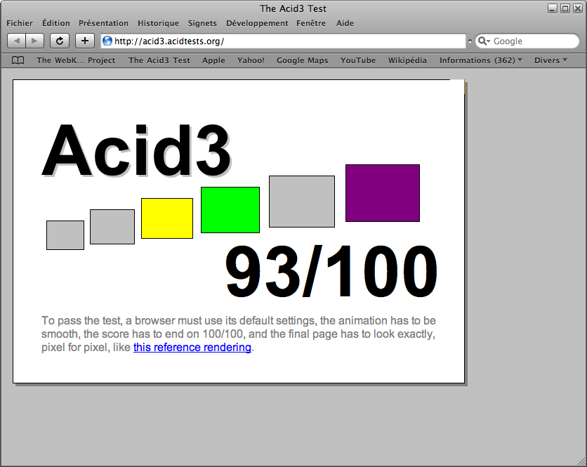 Après une très longue période de gestation en version bêta (les 3.0.x), voilà que la version 3.1 pointe le bout de son nez avec de belles améliorations. Pour rappel, Safari est le 3ème navigateur le plus répandu, notamment grâce à MacOS X, et maintenant via Windows. Le navigateur est aussi un petit concentré de technologie car il respecte la plupart des standards du W3C et affiche un très bon rendu des pages web, une bonne performance en exécution Javascript (quoique suivi de très près par Firefox 3 bêta 4). Les améliorations par rapport aux versions bêta 3.0.x sont facilement remarquables de part la disponibilité de l'interface en version multilingue et de la présence d'outils développeur de toute beauté, la sécurité du navigateur a également été améliorée. Safari 3.1 est donc disponible dès aujourd'hui pour Mac OS X (via les mises à jour système) et Windows. Télécharger Safari 3.1 (build 525.13) pour Windows (18.6 Mo)Bonus : Comme je le disais plus haut, Safari est réputé pour sa bonne gestion des standards.... preuve en est faite via cette petite comparaison entre Safari 3.1 et son moteur webkit fourni et la dernière nightly du moteur en date.