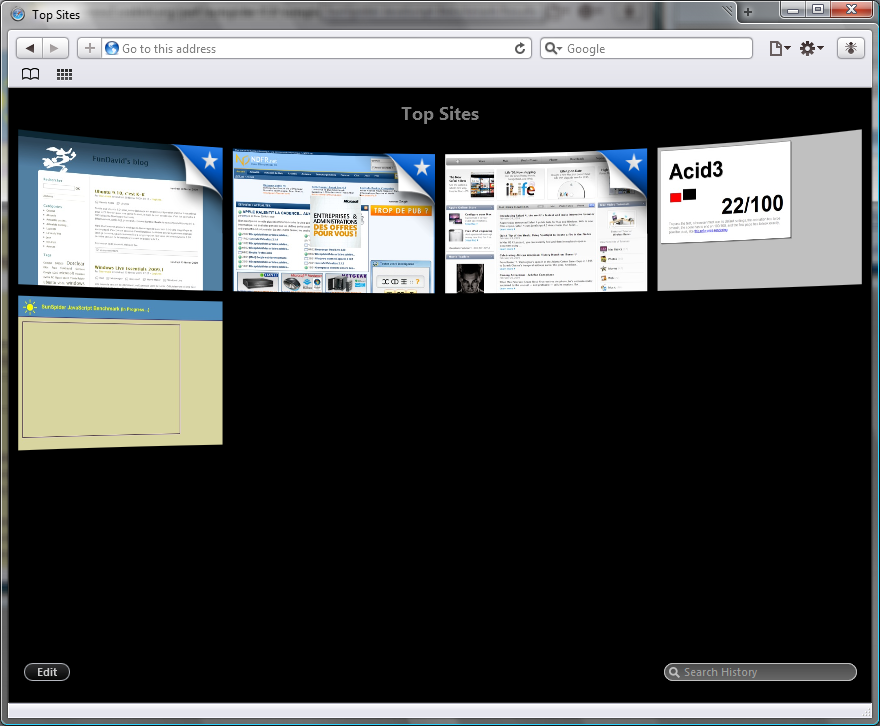 C'est justement la chose qui choque le plus sur Windows. Autant l'interface de Safari 4 Bêta sur Mac reste la même, c'est-à-dire une interface Cocoa grise, en accord complet avec le système. Mais sur le système d'exploitation de Redmond, adieu les couleurs Mac, bonjour Aero, d'ailleurs la technologie est bien exploitée ici, les onglets se gèrent dans la barre de titre elle-même dans un plus bel effet. Mais ce n'est qu'une partie des choses qui choquent, en effet, l'interface principale, menus et autres sous-menus sont largement inspirés de Google Chrome. Les menus ne sont pas apparents par défaut, il faut cliquer sur la bonne ligne dans le menu paramètres. Bref, dit comme ça, c'est pas très parlant. Peut-être avec une capture d'écran ? Autre fonctionnalité apparente, dès le démarrage, Top Sites. Un Speed Dial d'Opera un peu plus incurvé à la façon Cover Flow (largement utilisé dans iTunes et le Finder). Sinon, à part cela, l'Acid2 et l'Acid3 sont parfaitement respectés, et le moteur javascript nous donne un résultat de 984.2ms avec le test Sunspider, ce qui est quasi équivalent à Firefox 3.1b3pre (test réalisé sur un Intel Core 2 Quad Q8200 au démarrage du navigateur sur Windows Vista 32bits). Le résultat du test sous Safari 4 Bêta et le test que j'ai personnellement effectué au début du mois Safari est disponible publiquement pour MacOS et Windows, Télécharger Safari 4 Bêta