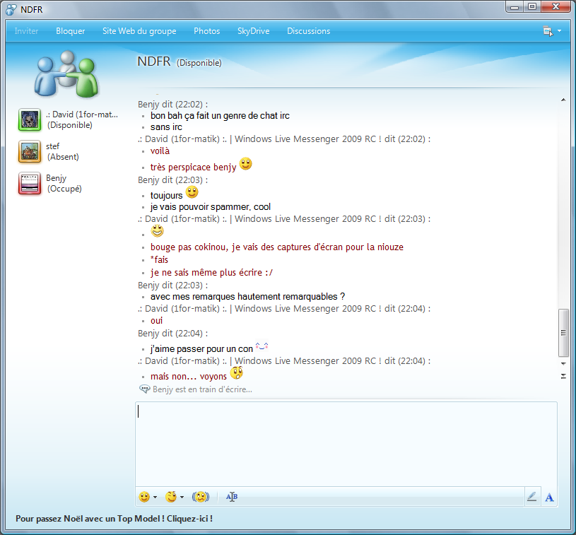 ![]() Non je plaisante... ![]() Sinon, dans l'état actuel, sous Windows 2008 Server, WLM refuse catégoriquement de se connecter... J'ai ma petite idée du pourquoi, j'essaierai à midi. Pas encore essayé (ni installé) les autres logiciels de la suite, mais je vais le faire pour me faire une idée.. Juste un ou deux défauts/bugs qu'il serait bon de corriger sur WLM (genre les smileys perso) EDIT : Ah et un petit truc non signalé... la possibilité de prendre une capture webcam comme image perso, ou encore utilisé différentes captures webcam et les utiliser en combinaison avec des "moods" (états d'humeurs) prédéfinis.
