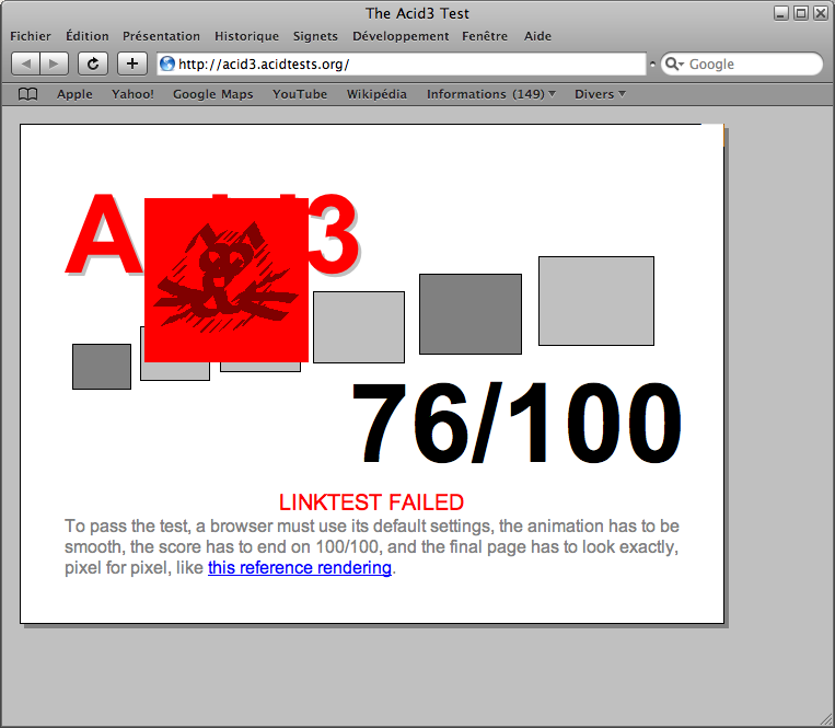 Microsoft, petite entreprise qui gagne à être connue (oui bon, je plaisante), avait annoncé il a quelques temps via des communiqués et même par des preuves vidéos qu'ils allaient rattraper leur retard sur les technologies actuelles. Effectivement quand on voit Firefox 2 qui gagne de plus en plus de parts de marché, Firefox 3 qui ne va pas vraiment tarder à sortir (avril ?) et surtout Safari 3.1 qui va (très bientôt) pointer le bout de son nez, sans oublier Opera 9.5. Tous ces navigateurs ont au moins une bonne longueur d'avance et relèguent IE7 au rang d'antiquité. C'est pour cela qu'est finalement sortie une nouvelle version d'Internet Explorer, pour l'instant en bêta 1, mais affiche une version dite "8". Cette version arrive avec quelques changements notable en commençant par un nouveau moteur d'affichage (on va plutôt dire mise à jour du moteur), et de petits extras sympathiques comme : Nouveautés Maintenant en ce qui concerne les promesses de Microsoft de faire d'Internet Explorer un navigateur "version 2008" prenant en charge les dernières technologies du web, on pourra vous rappeler que cette 8ème version possède 3 modes de moteurs : le mode "SuperStandard" (Activé par défaut, gérant CSS2.1 et même un petit début de HTML 5), le mode Normal (identique à IE7) et le mode "Quirks" équivalent au moteur d'IE5.- Activities : Ils permettent un accès rapide à certains services par le biais un petit bouton qui s'affiche sur une adresse ou sur un mot, nom, etc. - Webslices : Reconnaissance automatique d'un contenu dynamique présent sur une page web - La barre de favoris : Elle ressemble quasiment à celle de Firefox - Automatic Crash Recovery : Avec cette fonction, le navigateur ne risque plus de planter à cause d'une page mal codée ou un plug-in tiers. Maintenant, chaque onglet a son propre processus, si l'onglet plante, le navigateur ne plantera pas et vous proposera même de récupérer l'onglet plus tard. - Filtre Phishing Amélioré Dans la normale, et d'ailleurs annoncé il y a quelques temps par Microsoft, Internet Explorer 8 devrait supporter le test Acid2. J'ai donc fait le test et je ne peux que confirmer : On peut donc voir qu'Internet Explorer passe (enfin) le test Acid2 et devient d'ailleurs le dernier grand navigateur à le passer sans problèmes. Mais ne nous arrêtons pas là. Dernièrement, un nouveau test Acid (version 3) a vu le jour, il fait le point sur la gestion du Javascript, CSS3, ECMAScript, DOM level 2, SVG, HTML4 ou encore XHTML 1.0 par les navigateurs et leur attribue une note sachant que le test exécuté par IE6 et IE7 leur donne respectivement 11 et 12/100 et Firefox 2.0.0.12 obtient 50/100. Voici les résultats pour IE8 et les autres navigateurs concurrents : De gauche à droite : IE8 bêta 1, Firefox 3.0b5pre (build 2008030506-Win), Opera 9.50 bêta build 9815 et Safari 3.1A15 bêta Mais voilà, ce n'est qu'une version de développement, le moteur est encore en cours de perfectionnement car tous les sites ne passent pas bien, même avec le mode superstandard activé, jugez-en avec cette capture de votre site préféré : Installation d'Internet Explorer 8 bêta 1 : Très simple, presque aussi simple que celle de IE7 à sa sortie mais demande toute fois un redémarrage. Les utilisateurs de Vista pourront peut-être s'étonner de passer par la configuration en 3 étapes comme avec celle du SP1 ![]() Téléchargement : Internet Explorer 8 Bêta 1 est donc disponible pour Windows XP SP2 et SP3, Windows Server 2003 SP2, Windows Vista avec ou sans SP1 ainsi que Windows Server 2008, et ce, dans leurs versions 32 ou 64bits. Télécharger Internet Explorer 8 Bêta 1 en anglais pour Windows XP/Server 2003/Vista/Server 2008 32 ou 64 bitsDésinstaller Internet Explorer 8 Bêta 1 : Pour désinstaller Internet Explorer 8 bêta 1 après votre période de tests et retrouver votre IE6/7 dans l'état où il était, il vous suffira de vous rendre dans le Panneau de Configuration et : - Pour XP/2003, sélectionner Ajout/Suppression de Programmes puis descendre dans la liste pour cliquer sur le bouton Supprimer sur la ligne "Windows Internet Explorer 8" - Pour Vista/2008, sélectionner Programmes et fonctionnalités, une fois la fenêtre ouverte dans la partie verte à gauche, cliquer sur Afficher les mise à jour installées, sélectionner Windows Internet Explorer 8 puis Désinstaller dans la barre d'outils.