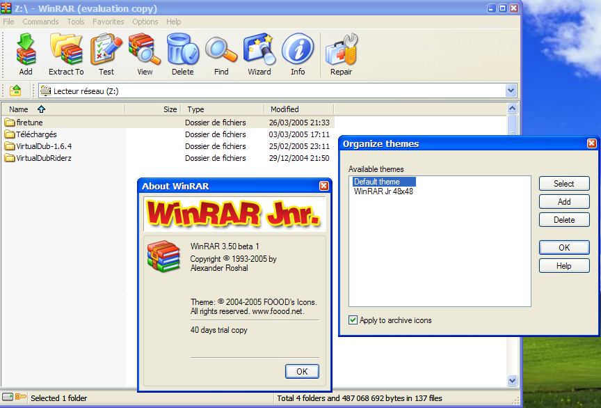 Aujourd'hui sort la 1ère beta de WinRAR 3.50. On peut noter un changement dans la gestion de l'interface, car, depuis que le pack WinRAR Jr. du créateur d'icônes Foood est sorti, les développeurs ont tout simplement décidé d'ajouter une fonction d'ajout de skins dans la nouvelle version, ainsi que d'améliorer la compression et la rapidité du logiciel